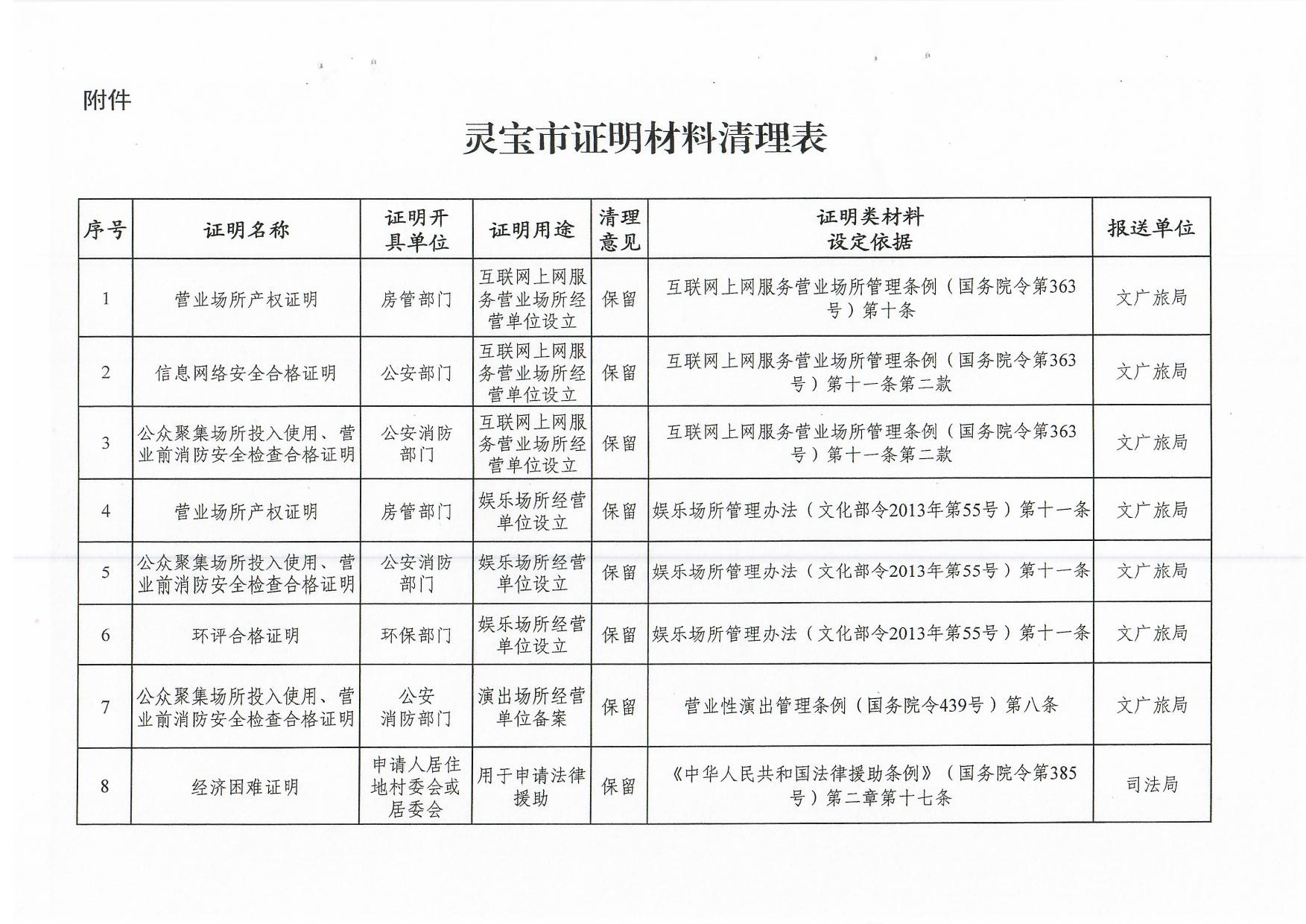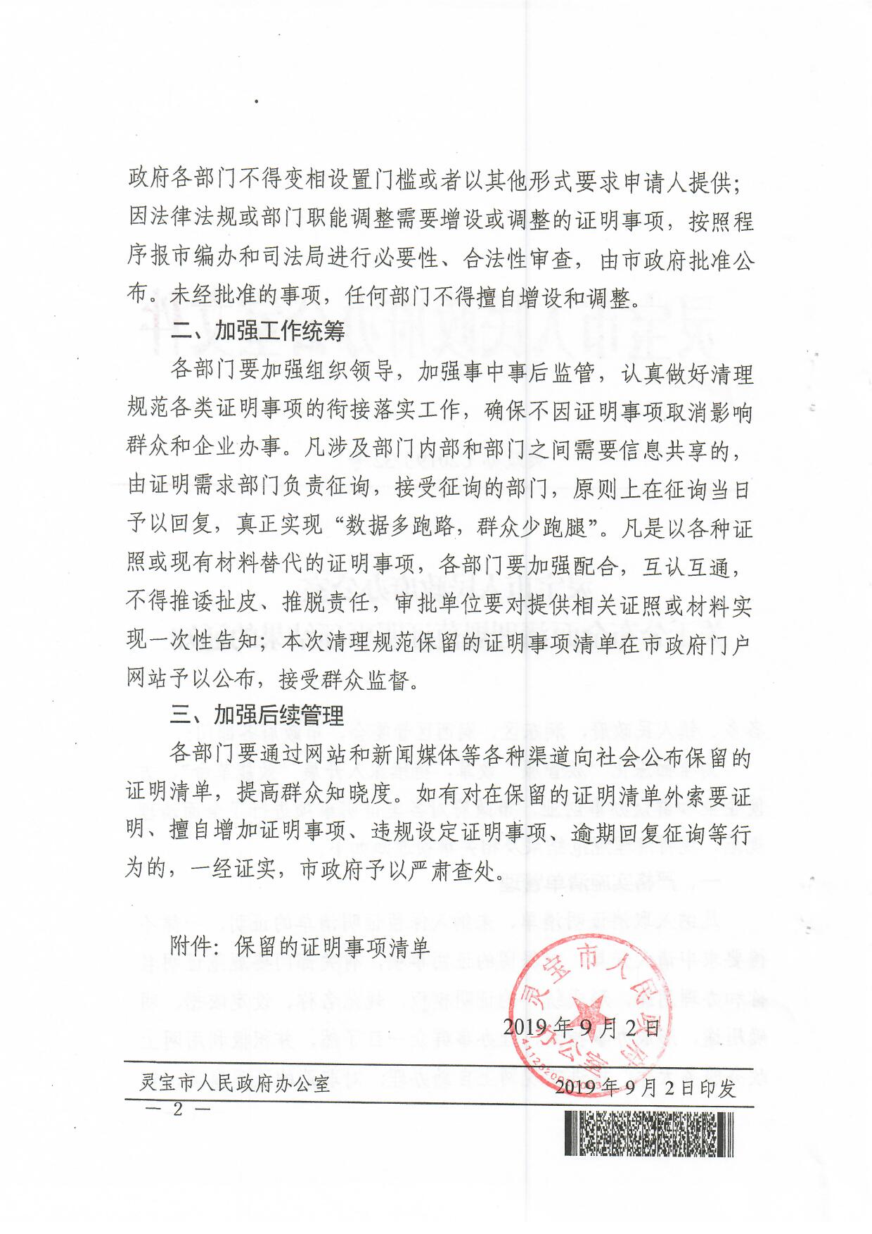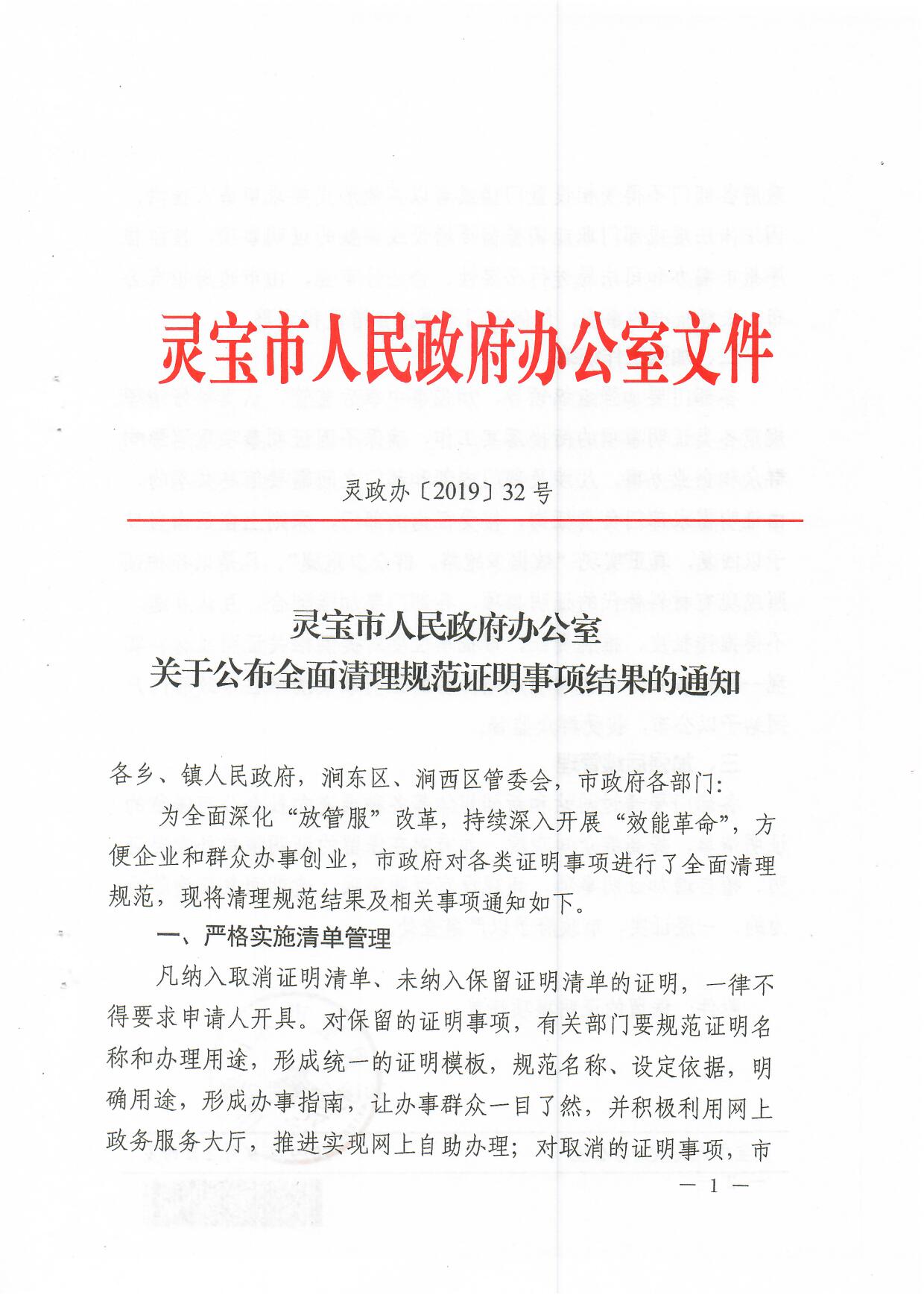 灵宝市人民政府办公室关于公布全面清理规范证明事项结果的通知