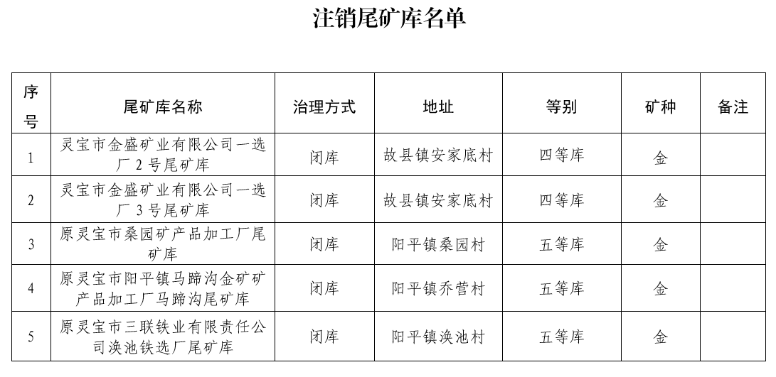 为有效防范化解我市境内尾矿库风险隐患,根据《中共中央办公厅 国务院办公厅关于进一步加强矿山安全生产工作的意见》《河南省安全生产监督管理局关于加强尾矿库闭库退出工作的通知》(豫安监管办〔2018〕24号)、《河南省应急管理厅 河南省发展和改革委员会 河南省工业和信息化厅 河南省财政厅 河南省自然资源厅 河南省生态环境厅 河南省水利厅 河南省气象局关于印发河南省防范化解尾矿库安全风险工作方案的通知》(豫应急〔2020〕89号)、《河南省安全生产委员会办公室关于印发〈河南省安全生产治本攻坚三年行动实施方案(2024—2026年)子方案〉的通知》(豫安委办〔2024〕46号)等精神,按照有关程序对灵宝市金盛矿业有限公司一选厂2号尾矿库等5座尾矿库实施了闭库治理,并经验收符合闭库退出规定,现予以注销。从通告发布之日起,灵宝市金盛矿业有限公司一选厂2号尾矿库等5座尾矿库退出安全生产领域,不再依照安全生产法规管理。