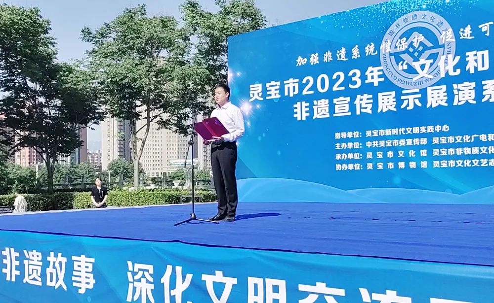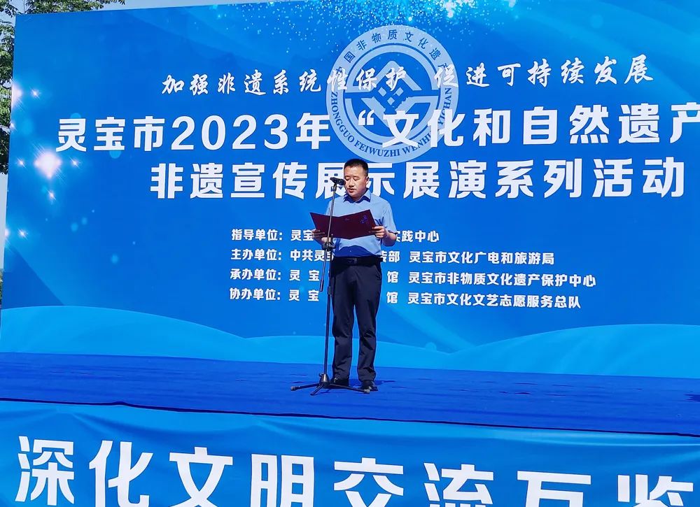 陈海涛致辞。他指出,文化遗产是人类智慧的结晶,是民族宝贵的物质和精神财富。各级各相关部门要认真学习贯彻习近平总书记关于文化工作重要讲话精神,以举办这次活动为契机,积极行动起来,用心、用情、用力做好非遗的传承与保护工作,推动形成人人传承优秀传统文化的生动局面,使之根脉相续、永葆活力,借助非遗之力,赓续文化薪火,讲好灵宝故事,为推动全市文化和旅游高质量发展助力赋能。