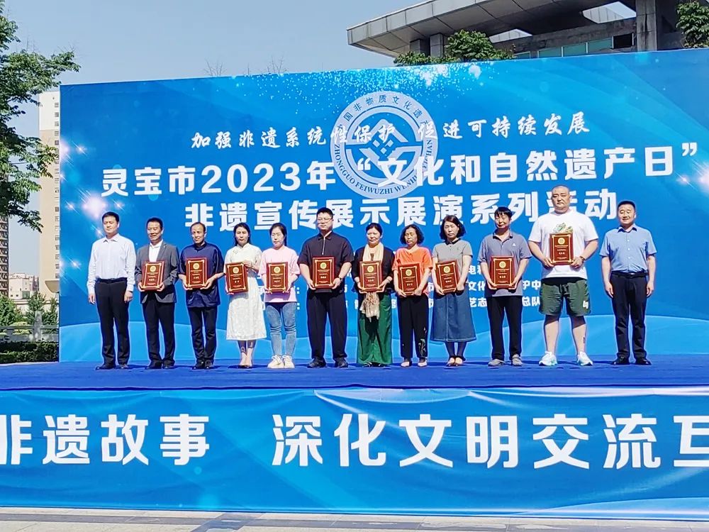 与会领导为第五批灵宝市级非物质文化遗产传承人代表颁发证书。