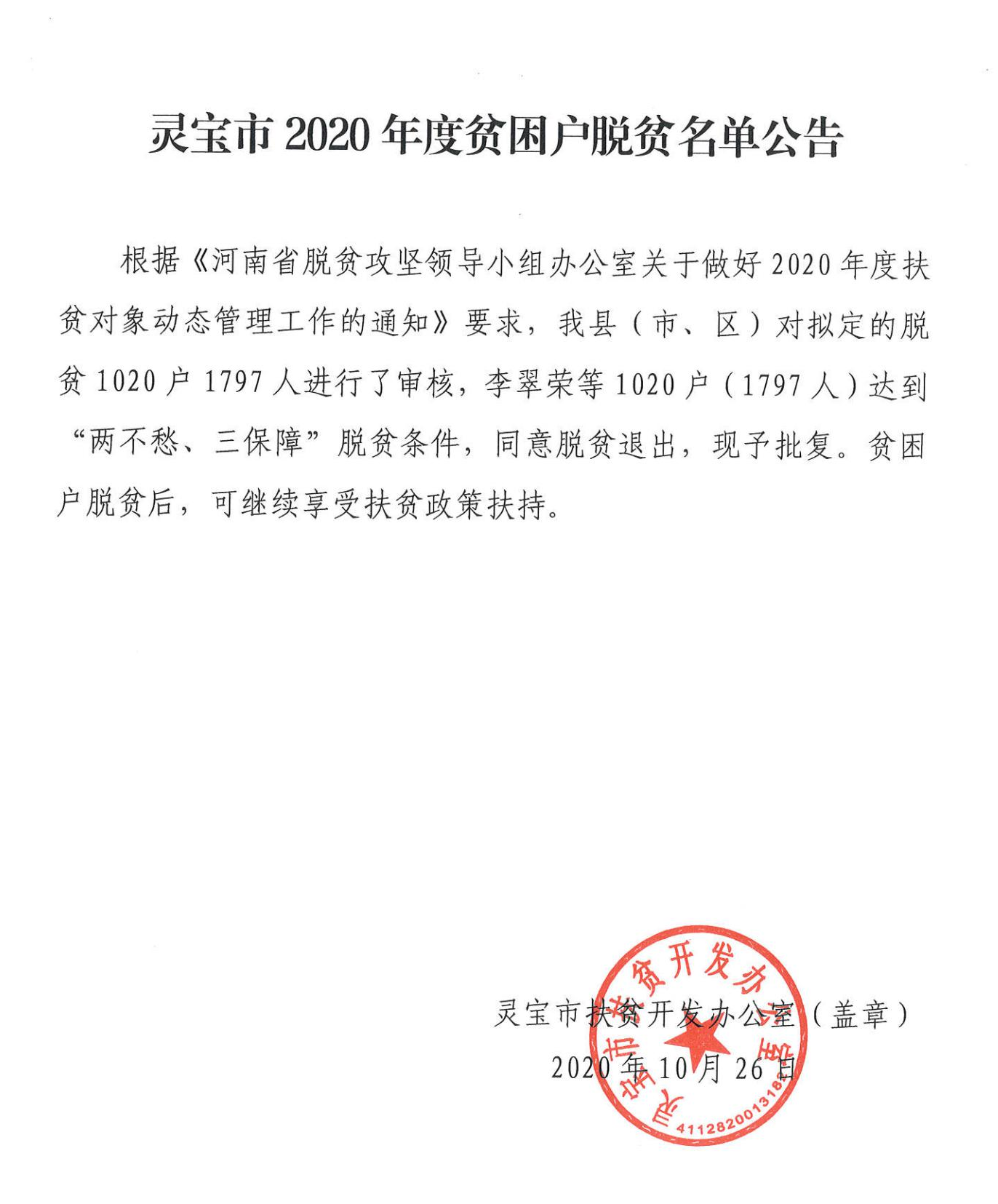 灵宝市2020年度贫困户脱贫名单公告