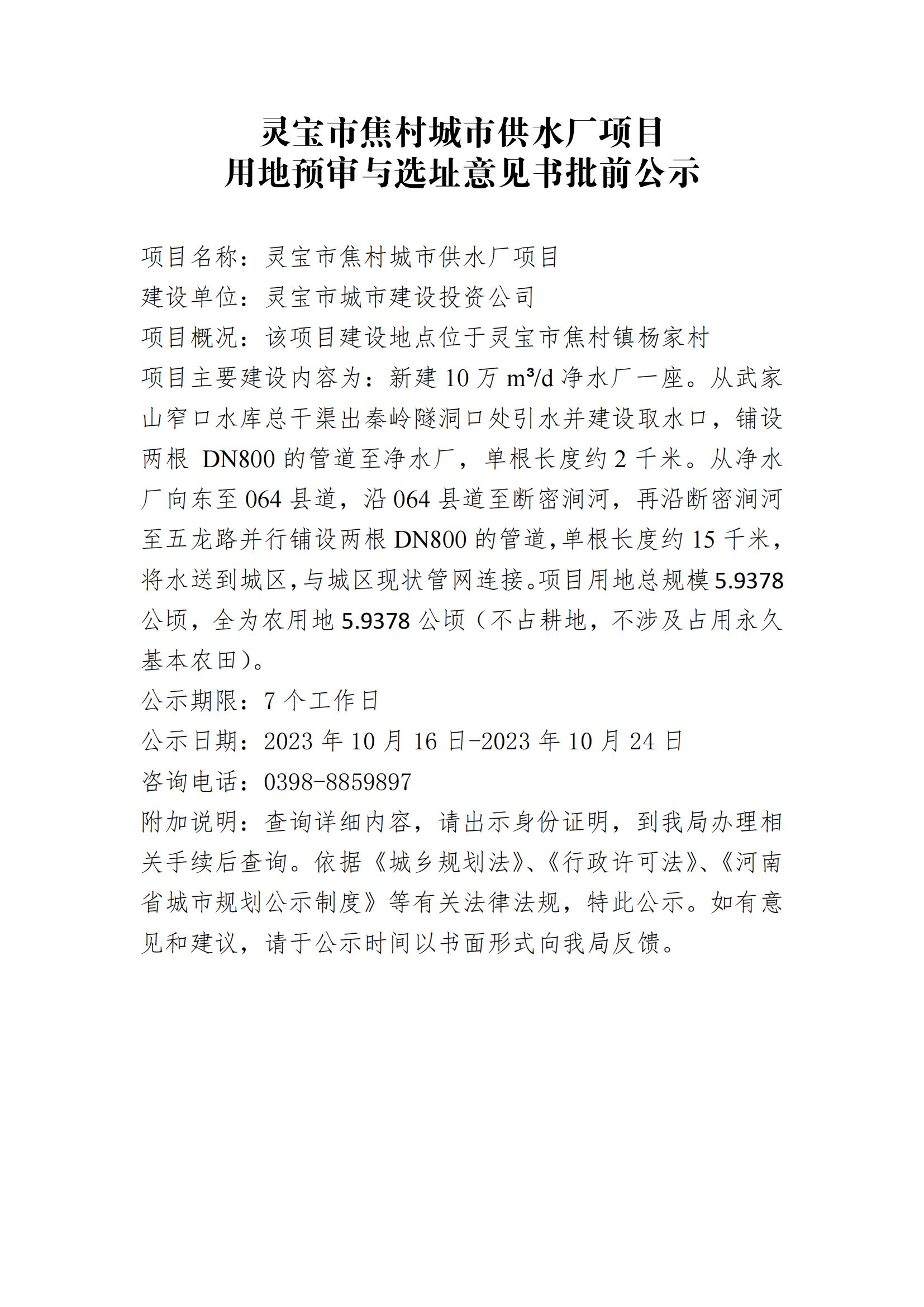 灵宝市焦村城市供水厂项目用地预审与选址意见书批前公示