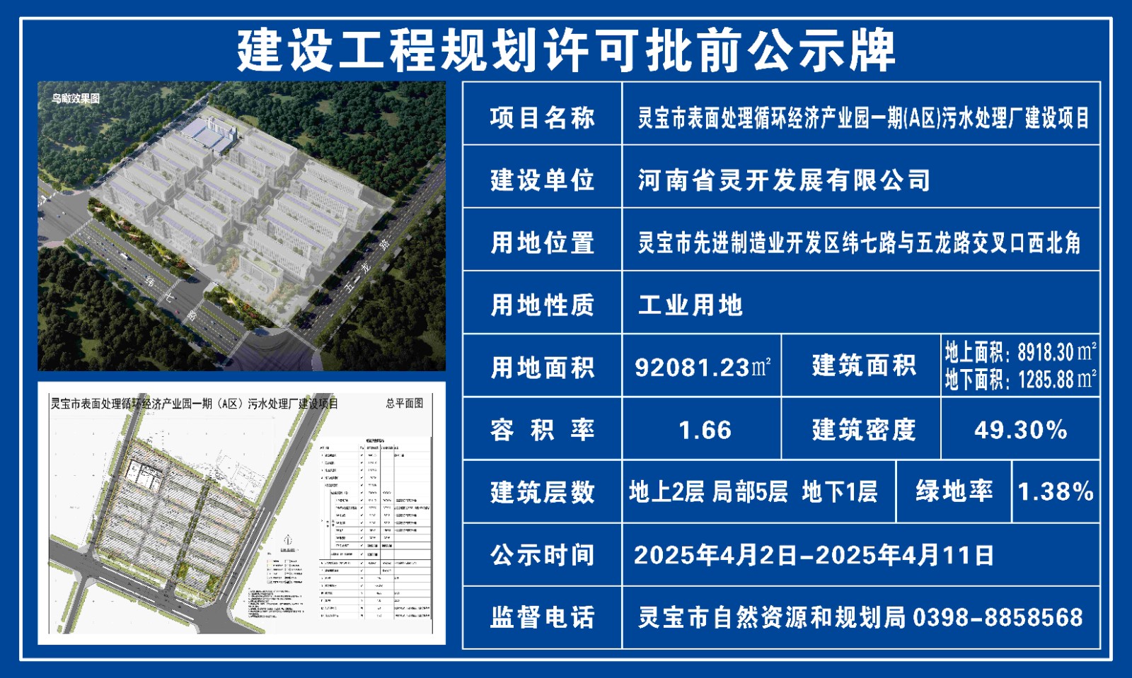 灵宝市表面处理循环经济产业园一期(A区)污水处理厂建设项目建设工程规划许可批前公示