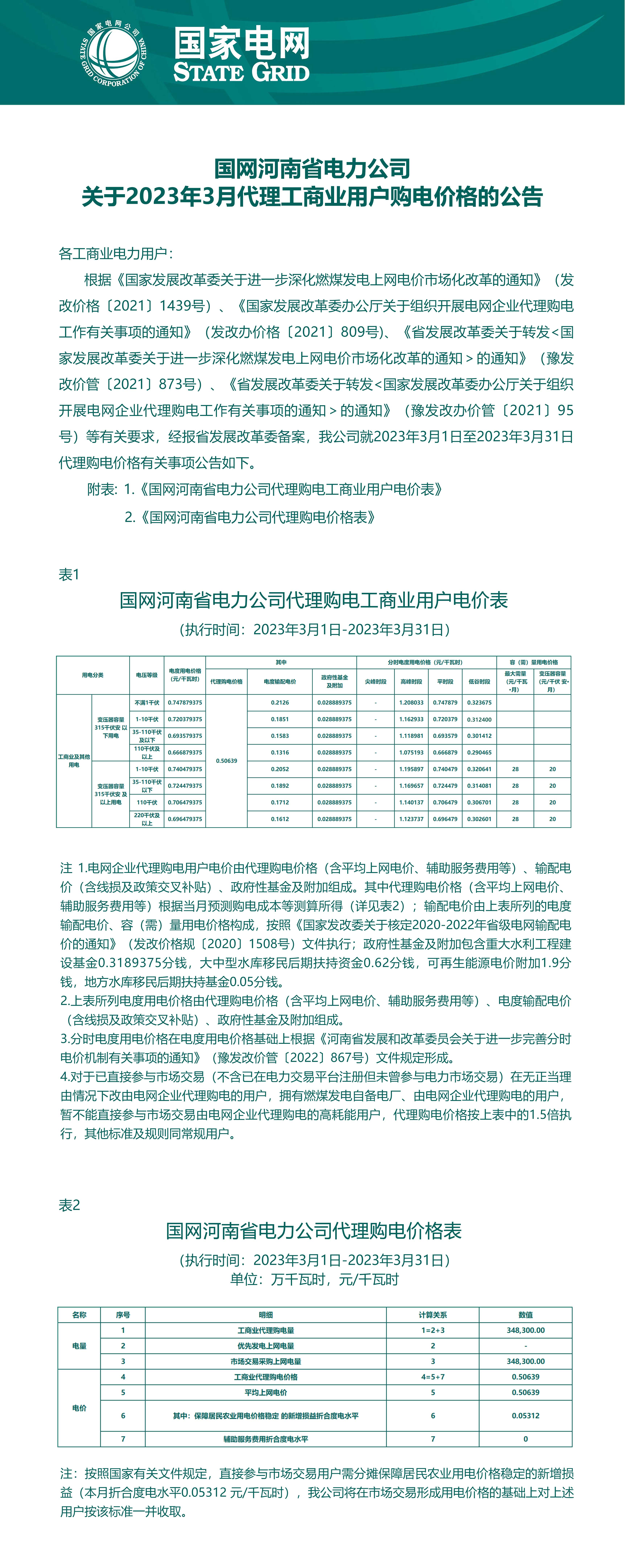 国网河南省电力公司代理购电工商业用户电价表(2023年3月)