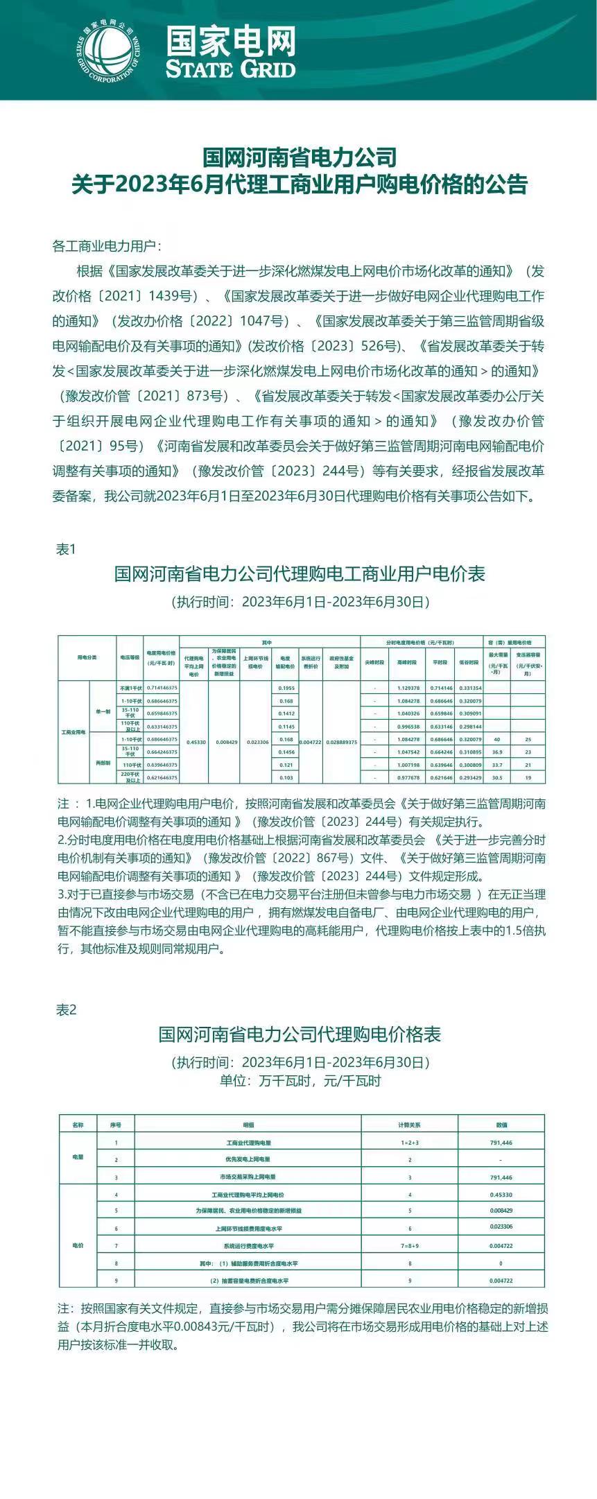 国网河南省电力公司代理购电工商业用户电价表(2023年6月)