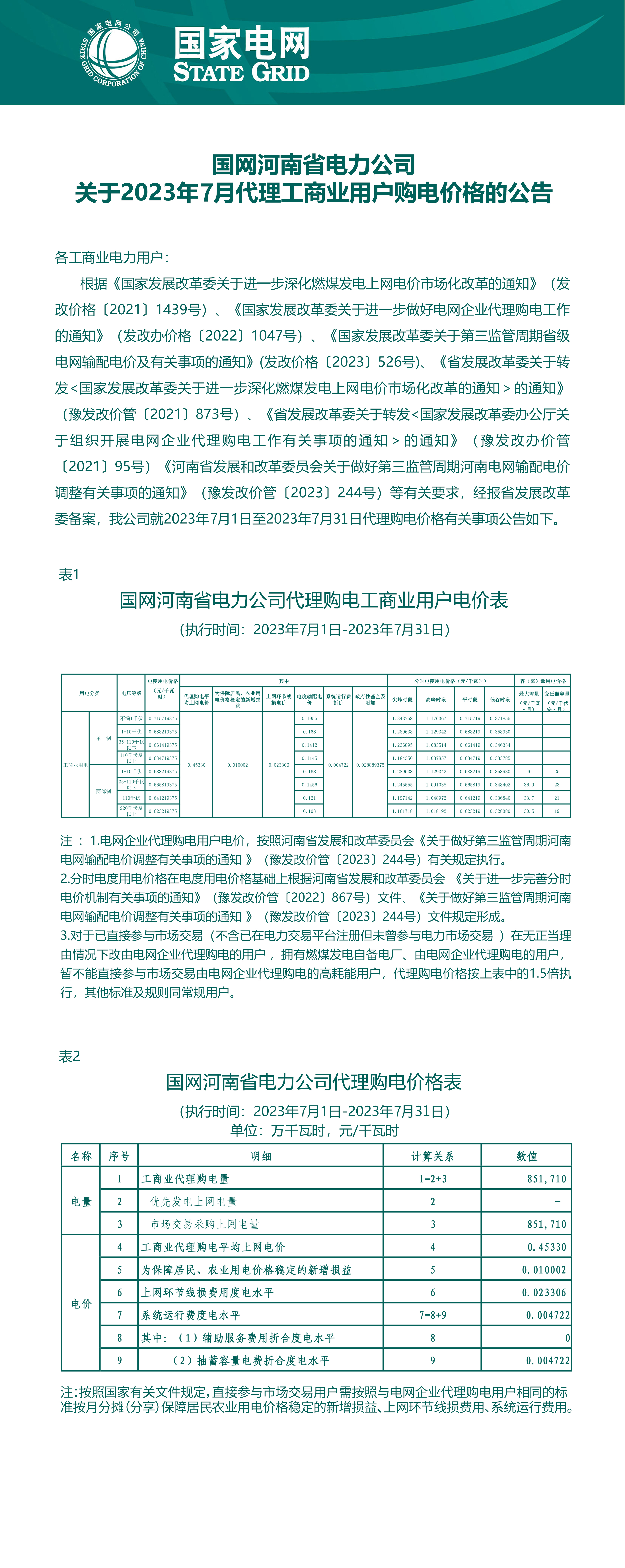 国网河南省电力公司代理购电工商业用户电价表(2023年7月)