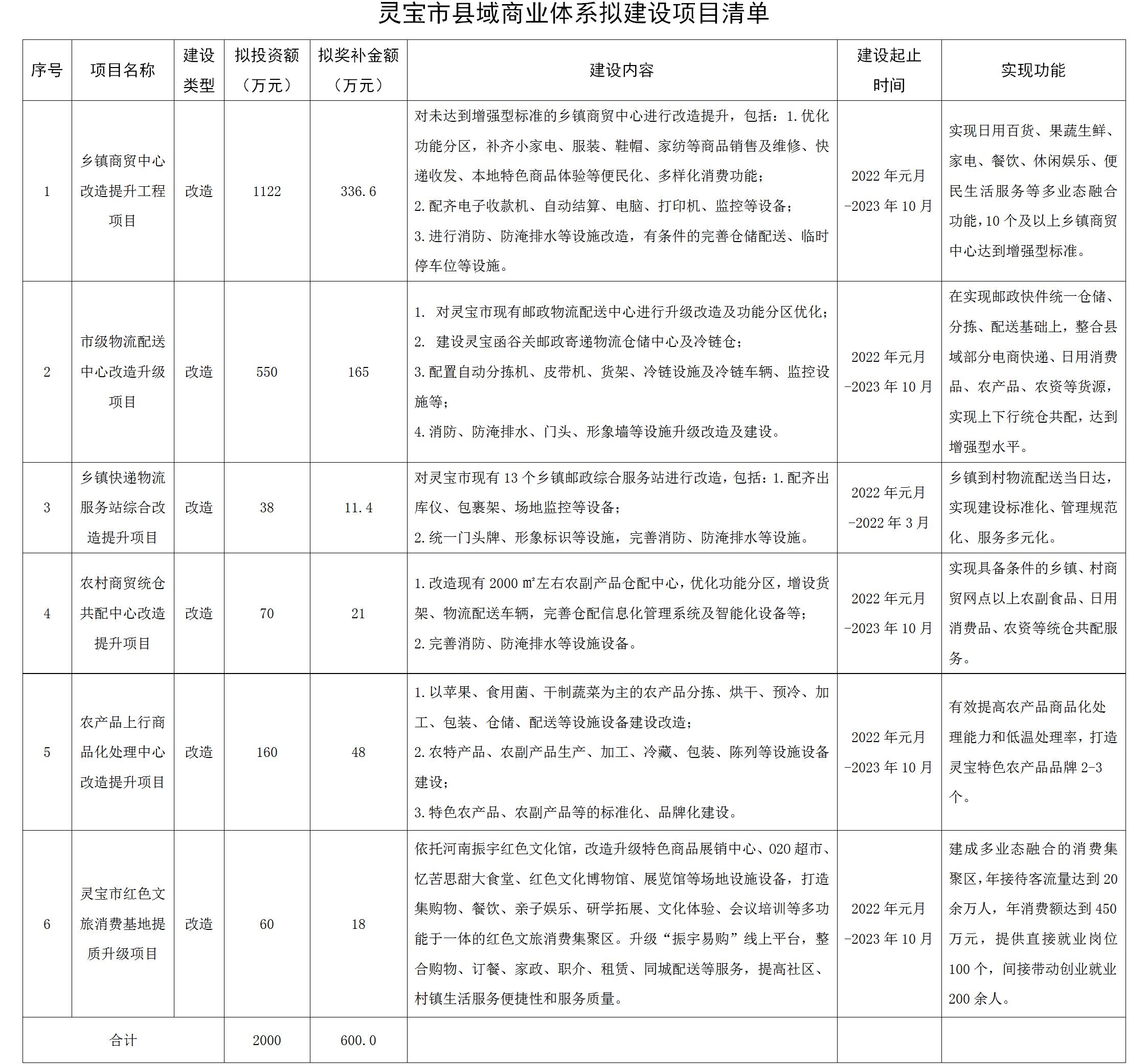 根据《财政部办公厅 商务部办公厅 国家乡村振兴局综合司关于支持实施县域商业建设行动的通知》(财办建〔2022〕18号)和《河南省商务厅 河南省财政厅 河南省乡村振兴局关于申报首批县域商业建设试点县(市)的通知》(豫商建〔2022〕4号)等文件精神,现将灵宝市县域商业体系拟建设项目清单公示如下。
