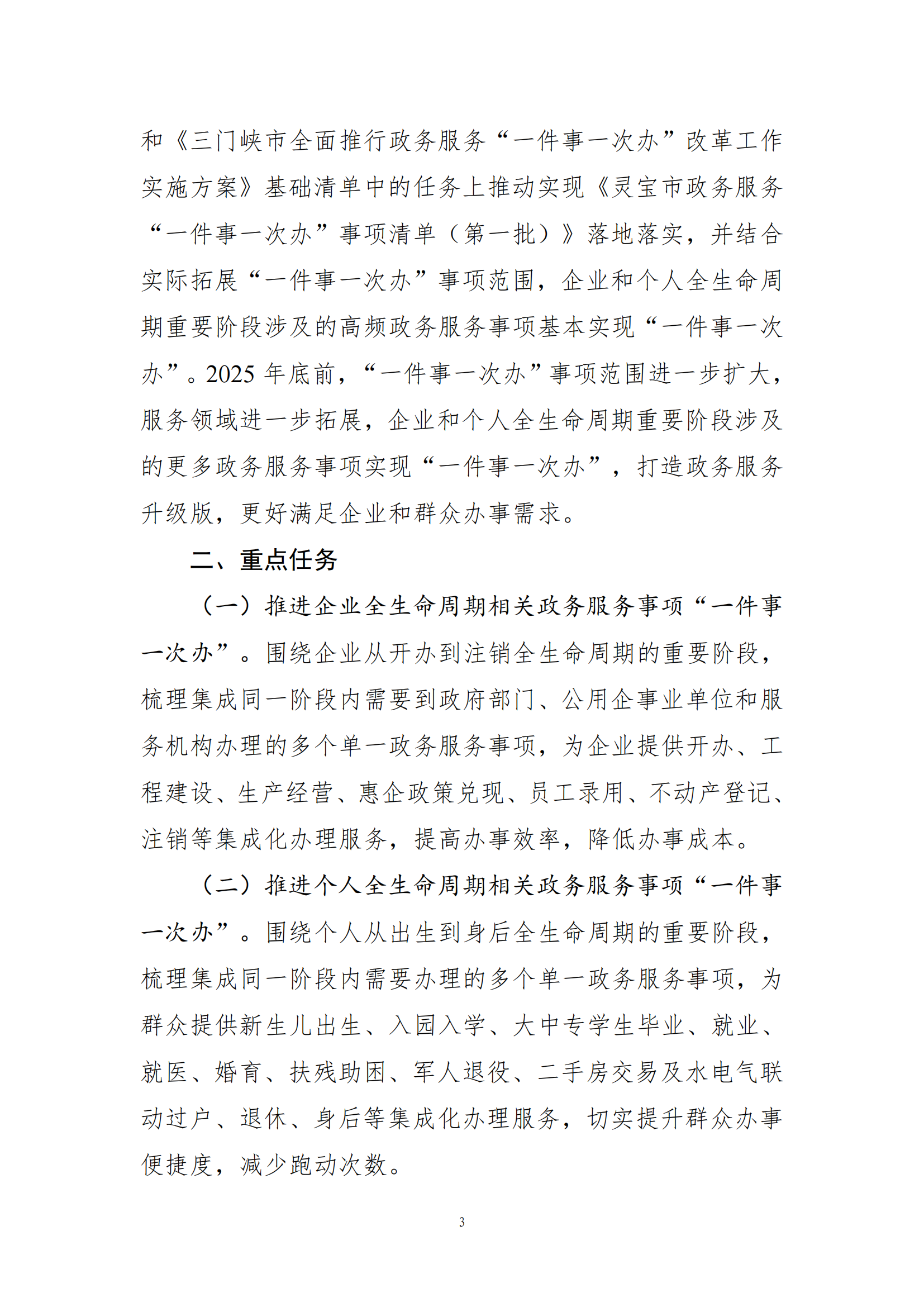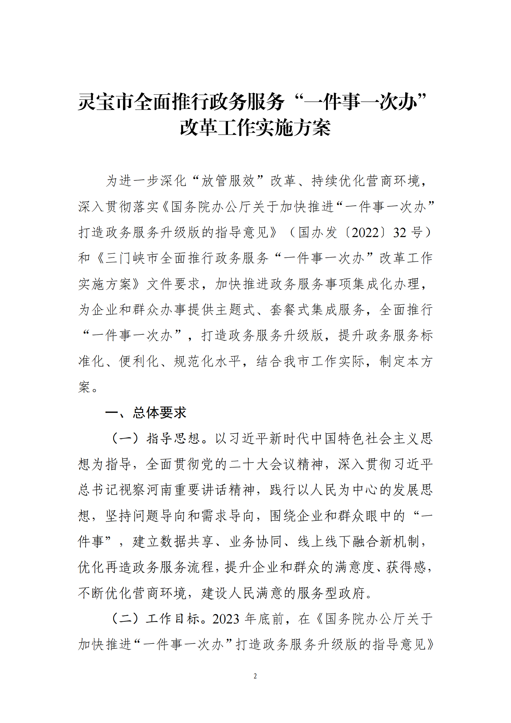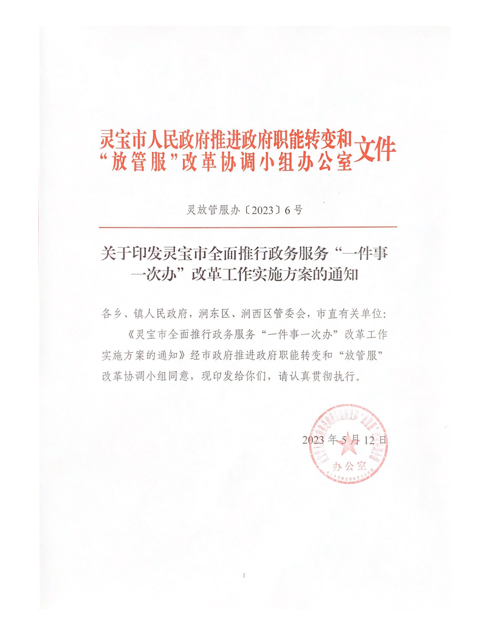 关于印发灵宝市全面推行政务服务“一件事一次办”改革工作实施方案的通知
