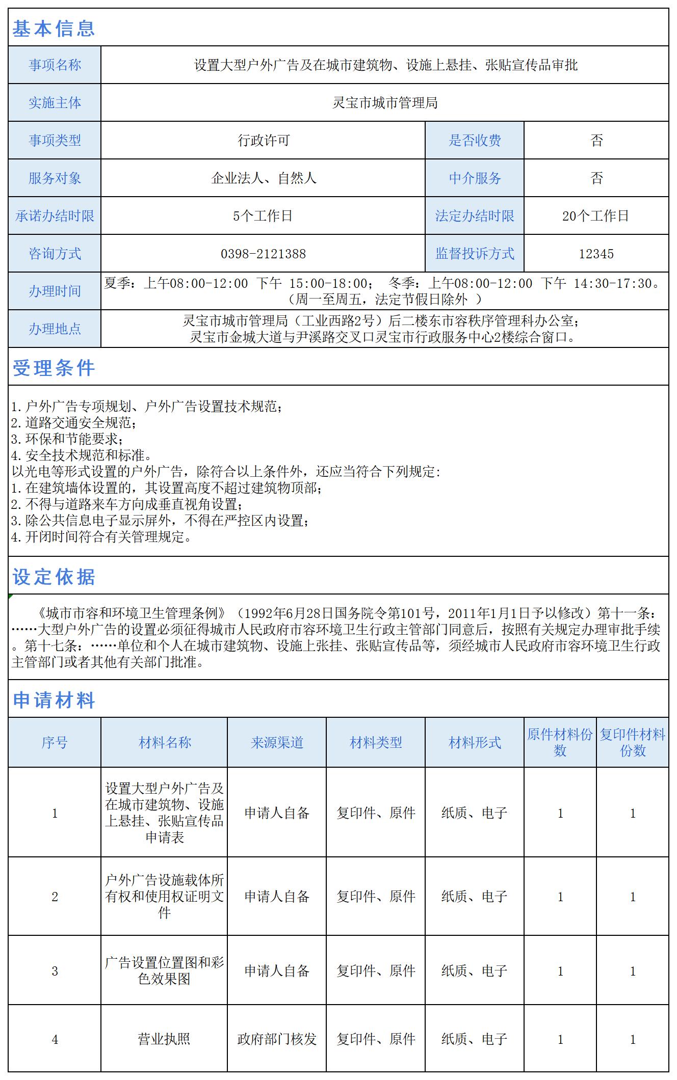 设置大型户外广告及在城市建筑物、设施上悬挂、张贴宣传品审批