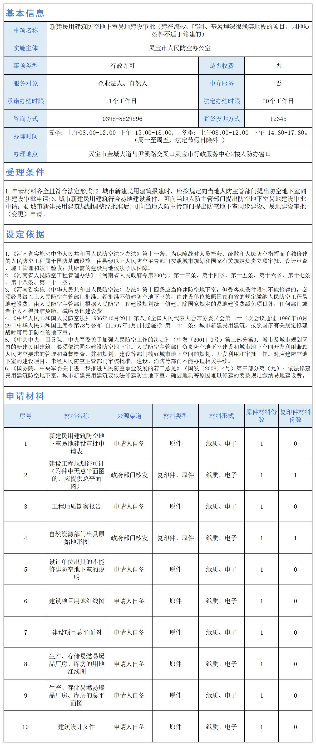 新建民用建筑防空地下室易地建设审批(建在流砂、暗河、基岩埋深很浅等地段的项目,因地质条件不适于修建的)