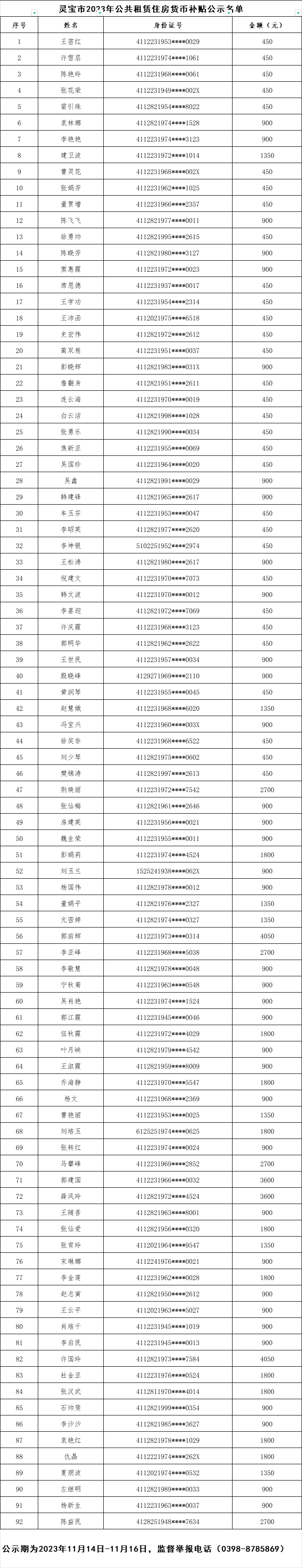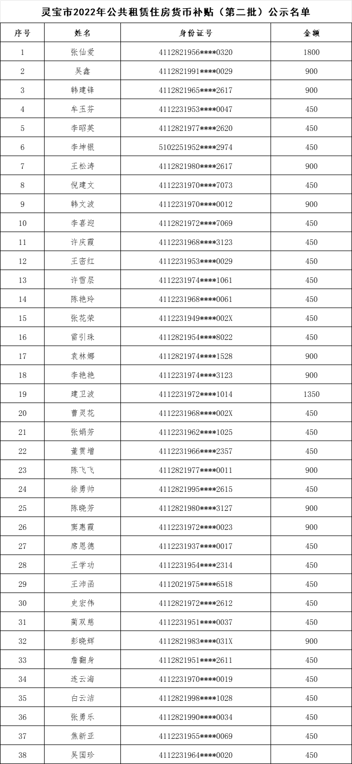 灵宝市公共租赁住房货币补贴公示名单