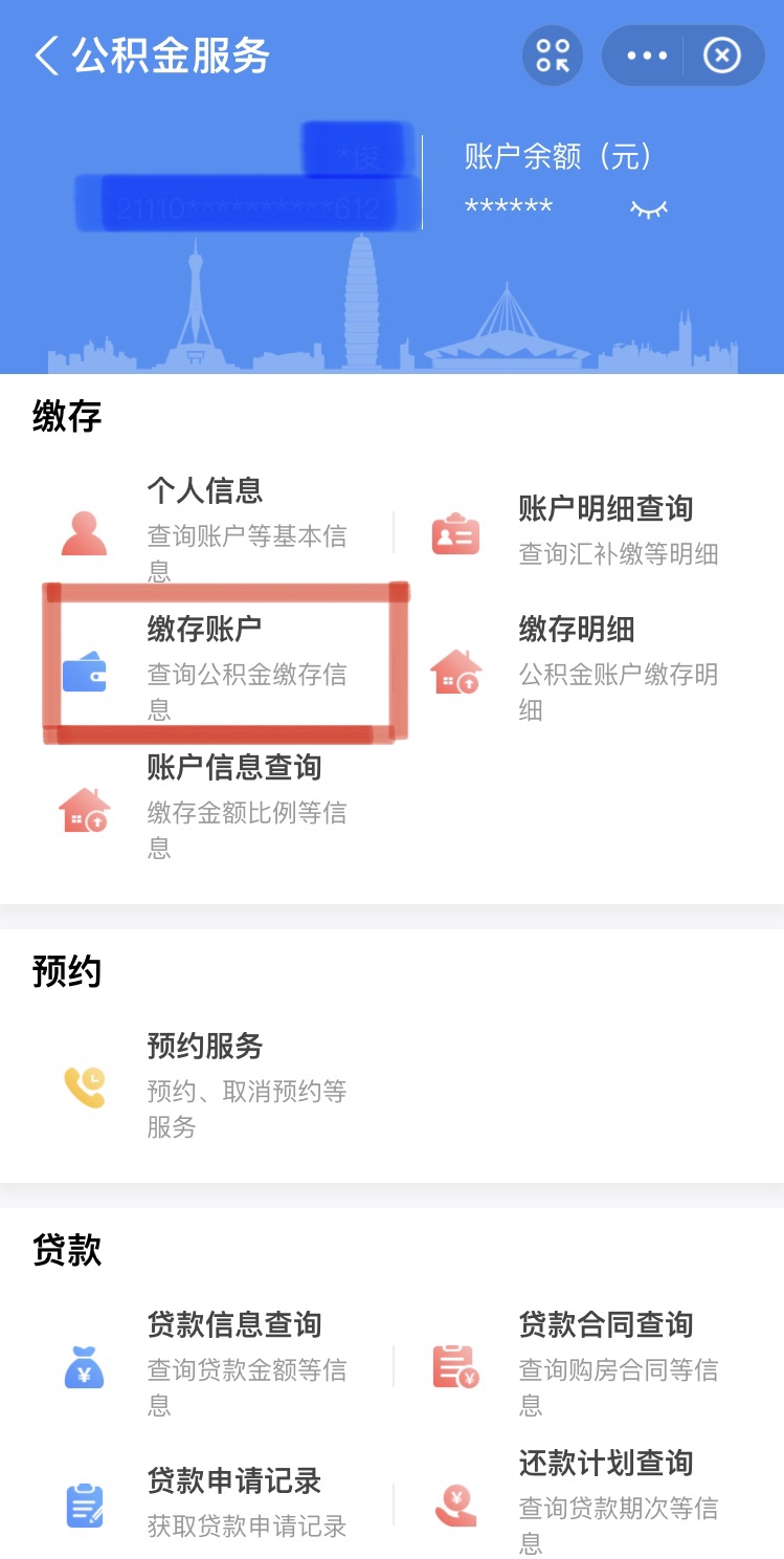 二、公积金服务页面,进入缴存模块,查询个人账户信息。具体可进行:个人账户信息查询、汇补缴明细查询、缴存比例信息查询等业务。
