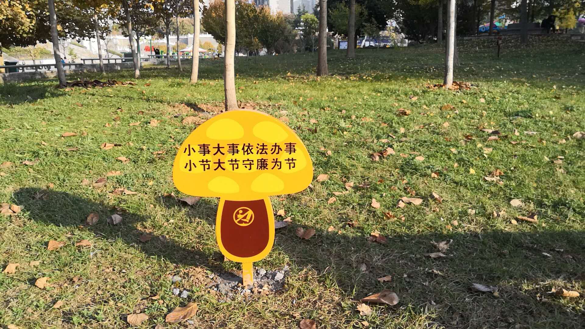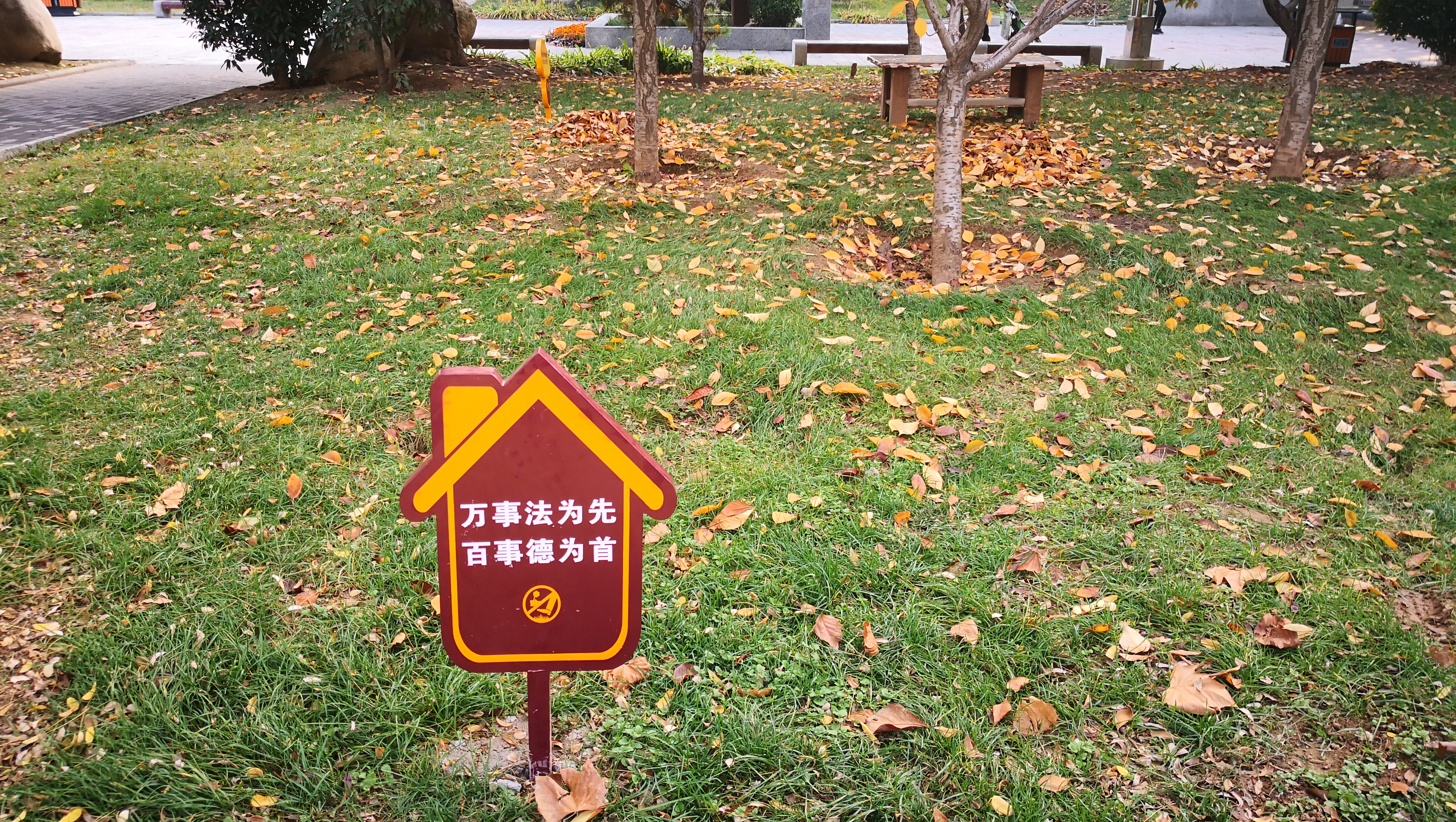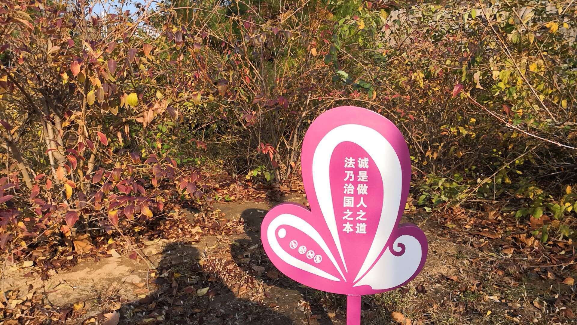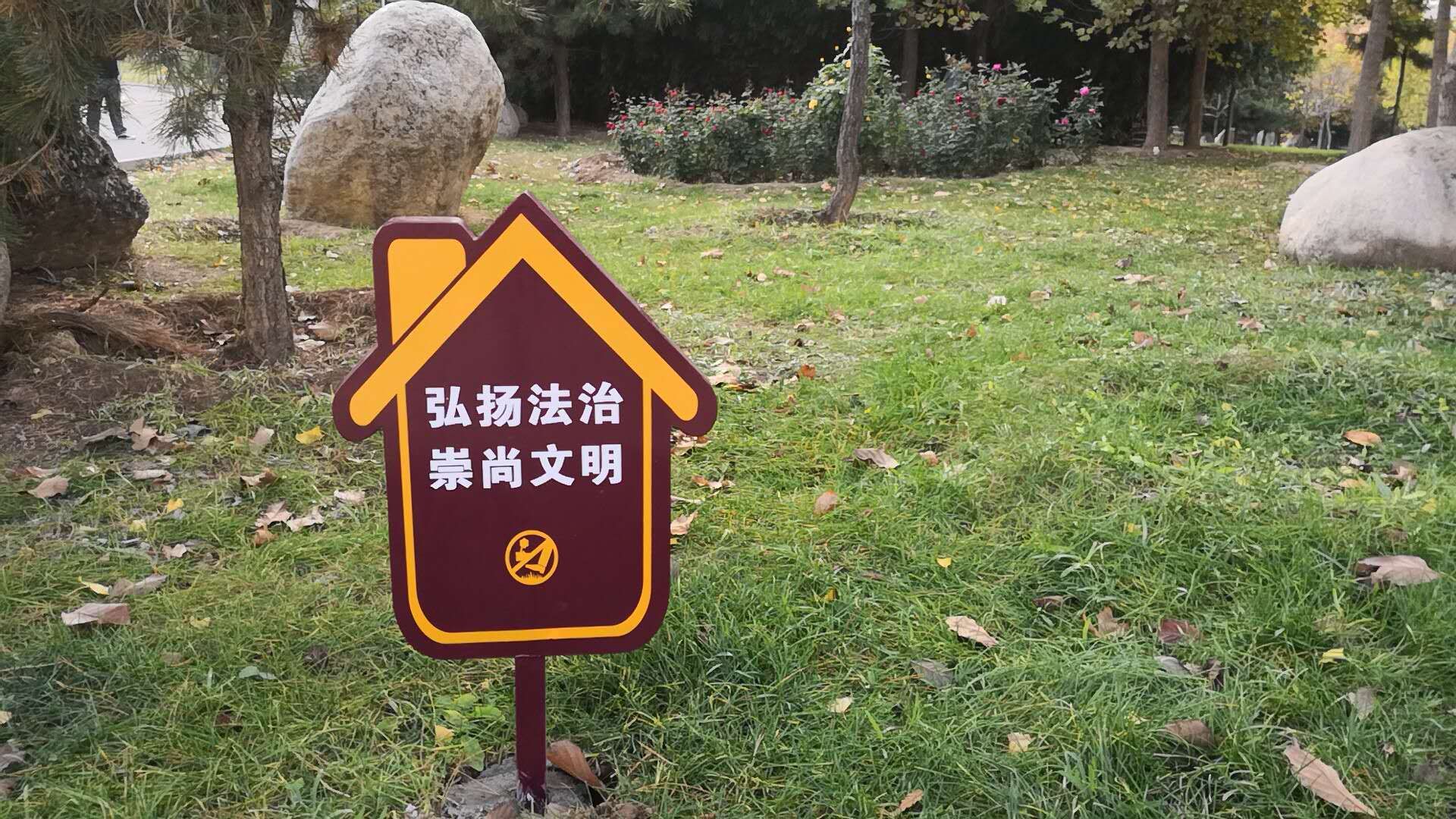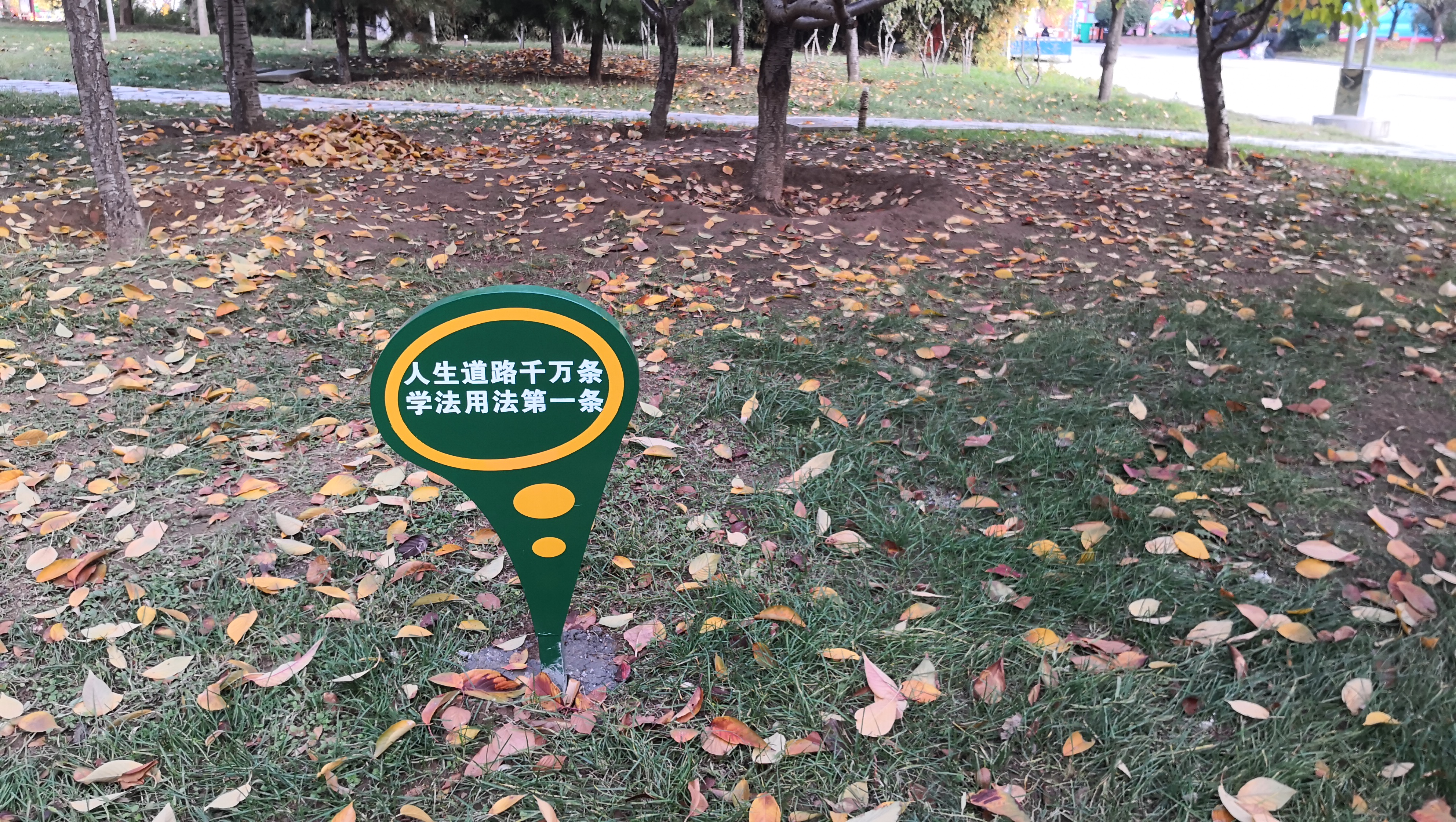 法治小贴士 公园草坪间,零星点缀着精心设计的法治小标牌30个,用温馨的法治小标语,普及法律常识,弘扬法治文明。