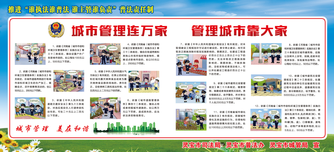 按照谁执法谁普法责任制,组织各行政执法单位设置法治宣传橱窗13个,其中公园环形跑道11个,西门入口2个,以图文并茂的形式宣传部门及行业法律法规。