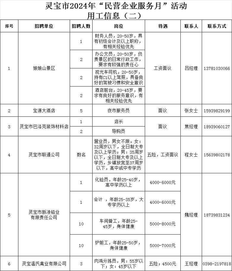 为深入贯彻党的二十大精神,促进民营经济高质量发展,多措并举稳就业促增收,按照河南省人力资源社会保障厅等6部门《关于开展2024年河南省民营企业服务月活动的通知》要求,市人力资源社会保障局、教育局、退役军人局、市总工会、 妇联、工商联定于4月中旬至5月中旬在全市开展2024年民营企业服务月活动。市人社局现将企业用工信息公布如下,请有就业意向的求职者关注。具体岗位信息如下: