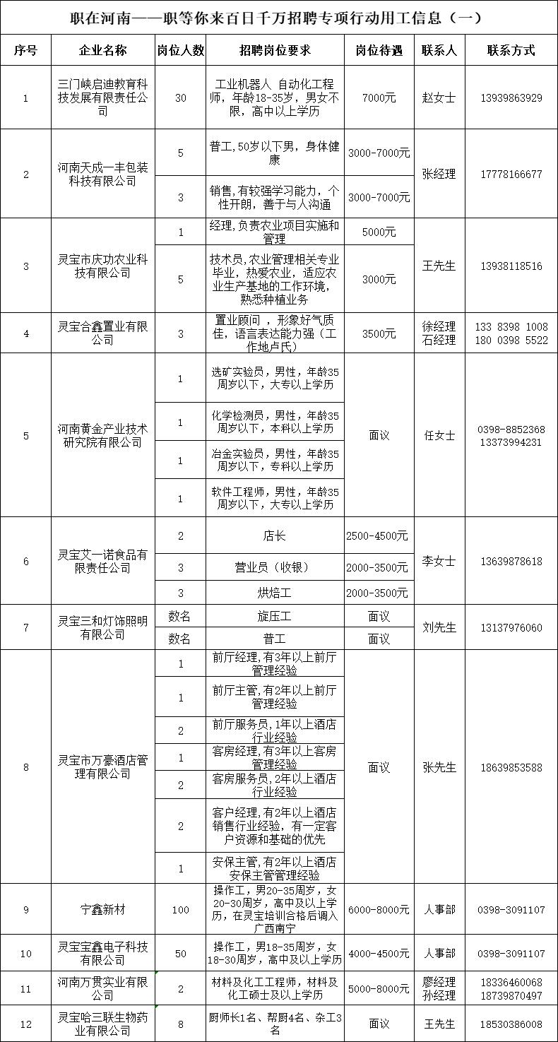 为深入贯彻党中央、国务院和省委、省政府关于促进高校毕业生等青年就业工作决策部署,落实全国高校毕业生等青年就业创业工作视频会议精神,强化就业服务,畅通求职招聘渠道,提高对接匹配效率,按照人力资源社会保障部办公厅《关于开展2024年“百日千万招聘专项行动”的通知》。灵宝市人社局现将企业用工信息公布如下,请有就业意向的求职者关注。具体岗位信息如下: