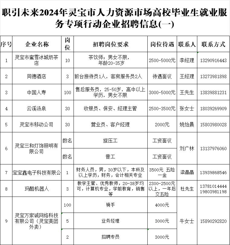 为全面贯彻党的二十届三中全会精神,落实党中央、国务院、省、市关于促进高质量充分就业决策,充分发挥市场在人力资源配置中的决定性作用,进一步加强人力资源供需对接,积极促进高校毕业生等重点群体市场化社会化就业,决定开展2024年灵宝市人力资源市场高校毕业生就业服务专项行动。市人社局现将企业用工信息公布如下,请有就业意向的求职者关注。具体岗位信息如下: