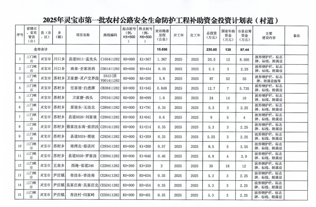 附件:2025年灵宝市第一批农村公路安全生命防护工程补助资金投资计划表