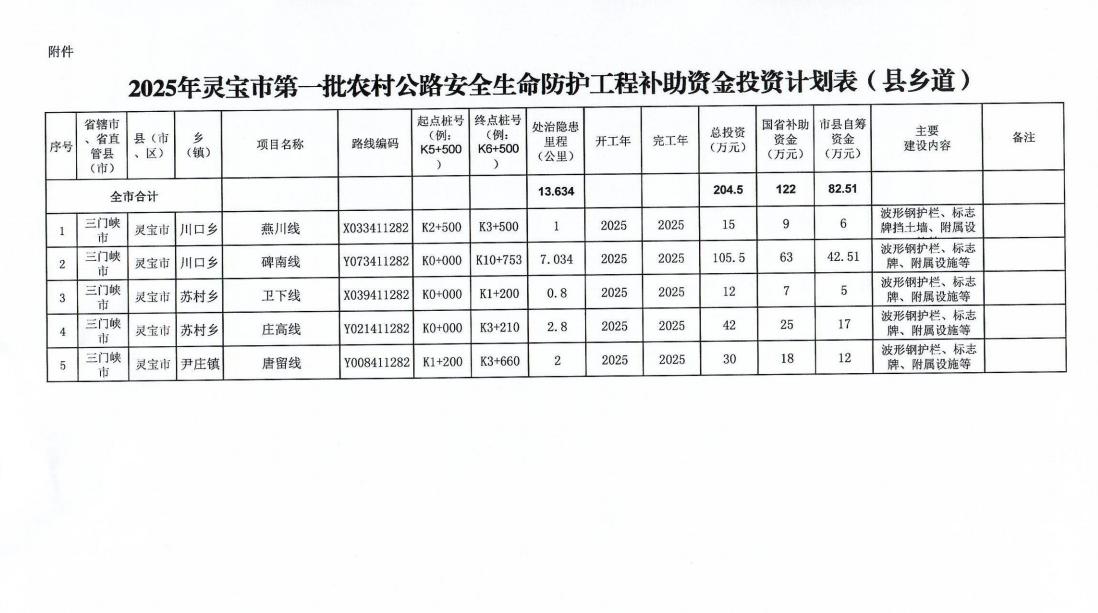 根据豫交规划函〔2025〕40号《河南省交通运输厅关于下达河南省2025年第一批农村公路建设养护补助资金投资计划的通知》精神,现下达我市2025年灵宝市第一批农村公路安全生命防护工程项目20条路,处置隐患里程29.33公里(县道2条,乡道3条,村道15条),现予以公示。
