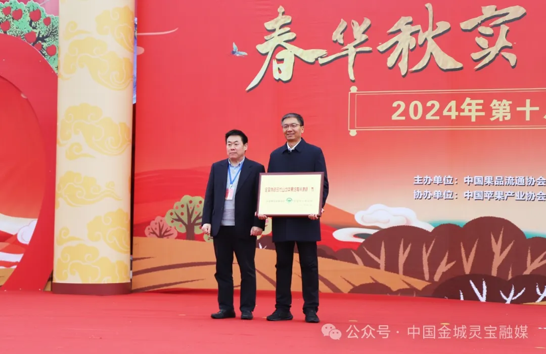 开幕式上,中国果品流通协会副会长张庆丰为灵宝市颁授“全国特色山地苹果培育共建县(市)”牌匾。