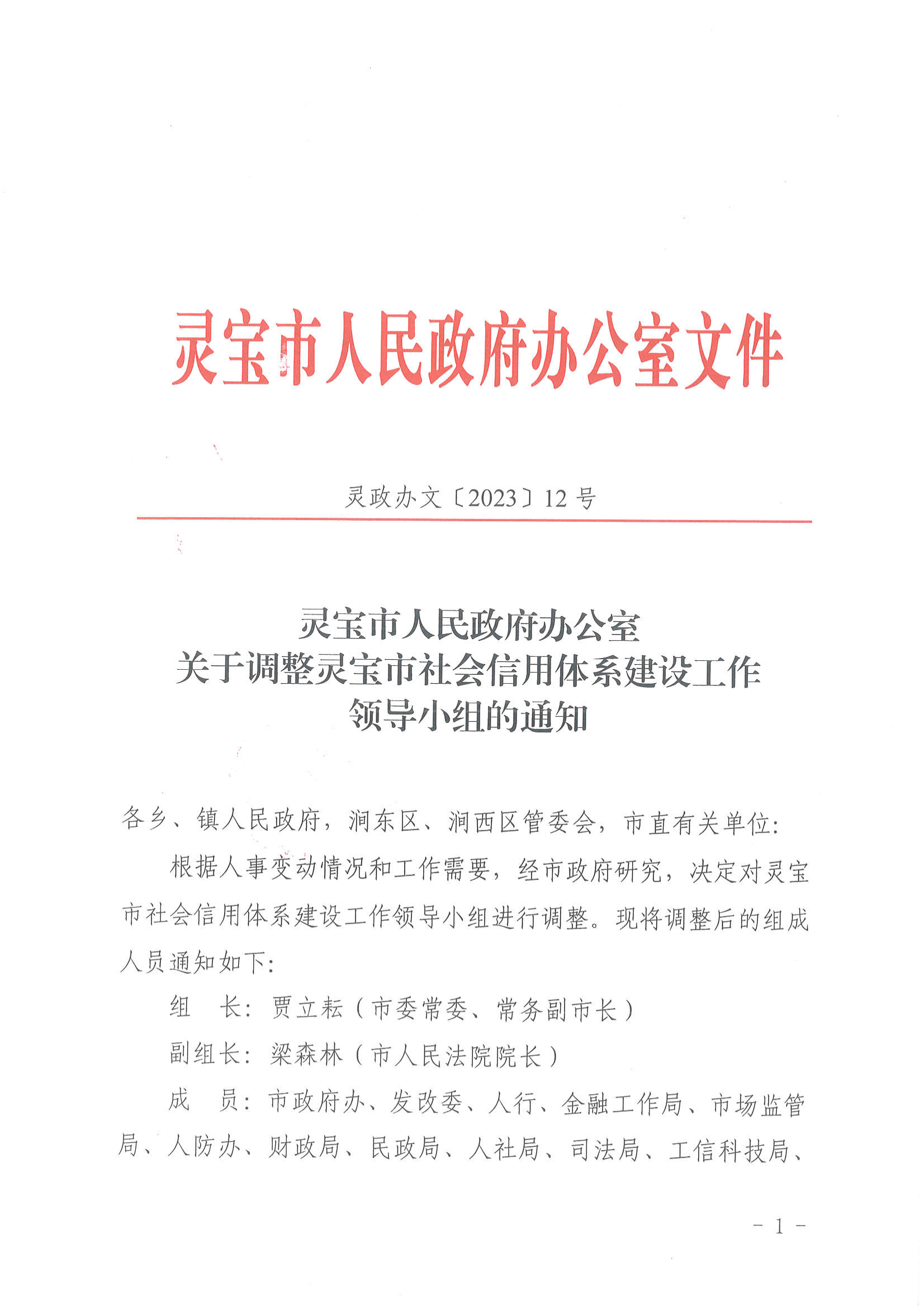 灵宝市人民政府办公室关于调整灵宝市社会信用体系建设工作领导小组的通知