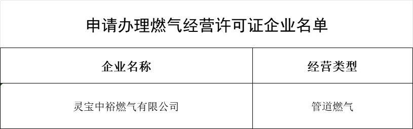 根据《行政许可法》、《城镇燃气管理条例》、《河南省城镇燃气管理办法》及《河南省城镇燃气经营许可证管理办法》等有关法律法规,市住建局对申请办理燃气经营许可证的燃气企业按照程序、通过材料审核方式对申请人的经营许可条件进行了审查,现将符合燃气经营许可证条件的1家企业名单予以公布。
