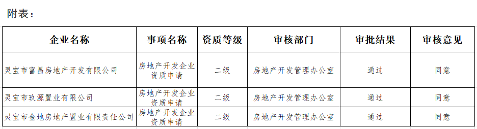 根据《河南省城市房地产开发经营管理条例》、原建设部令第77号、住建部令第24号以及豫政办[2020]36号、三政办[2020]19号文件相关规定,现对灵宝市富昌房地产开发有限公司、灵宝市玖源置业有限公司、灵宝市金地房地产置业有限责任公司的房地产开发资质予以公示。公示期为2023年9月13日至2023年9月21日。