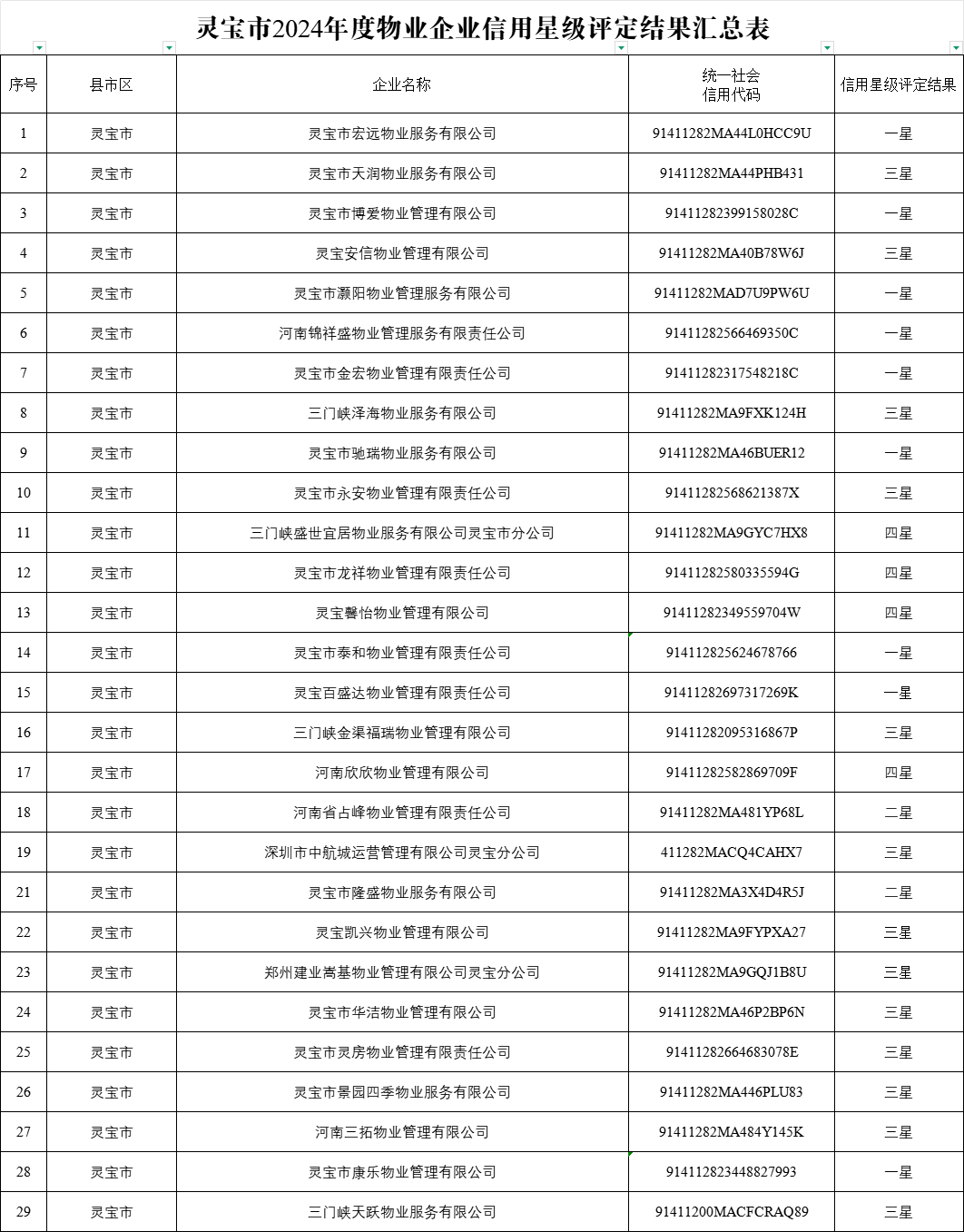 根据《河南省物业服务企业信用管理实施办法(试行)》,经组织专家综合评定,现将2024年度灵宝市物业服务企业星级评定结果予以公示,公示时间2025年5月19日起——25日止,如有异议,请以书面形式反馈至灵宝市住房和城乡建设局。