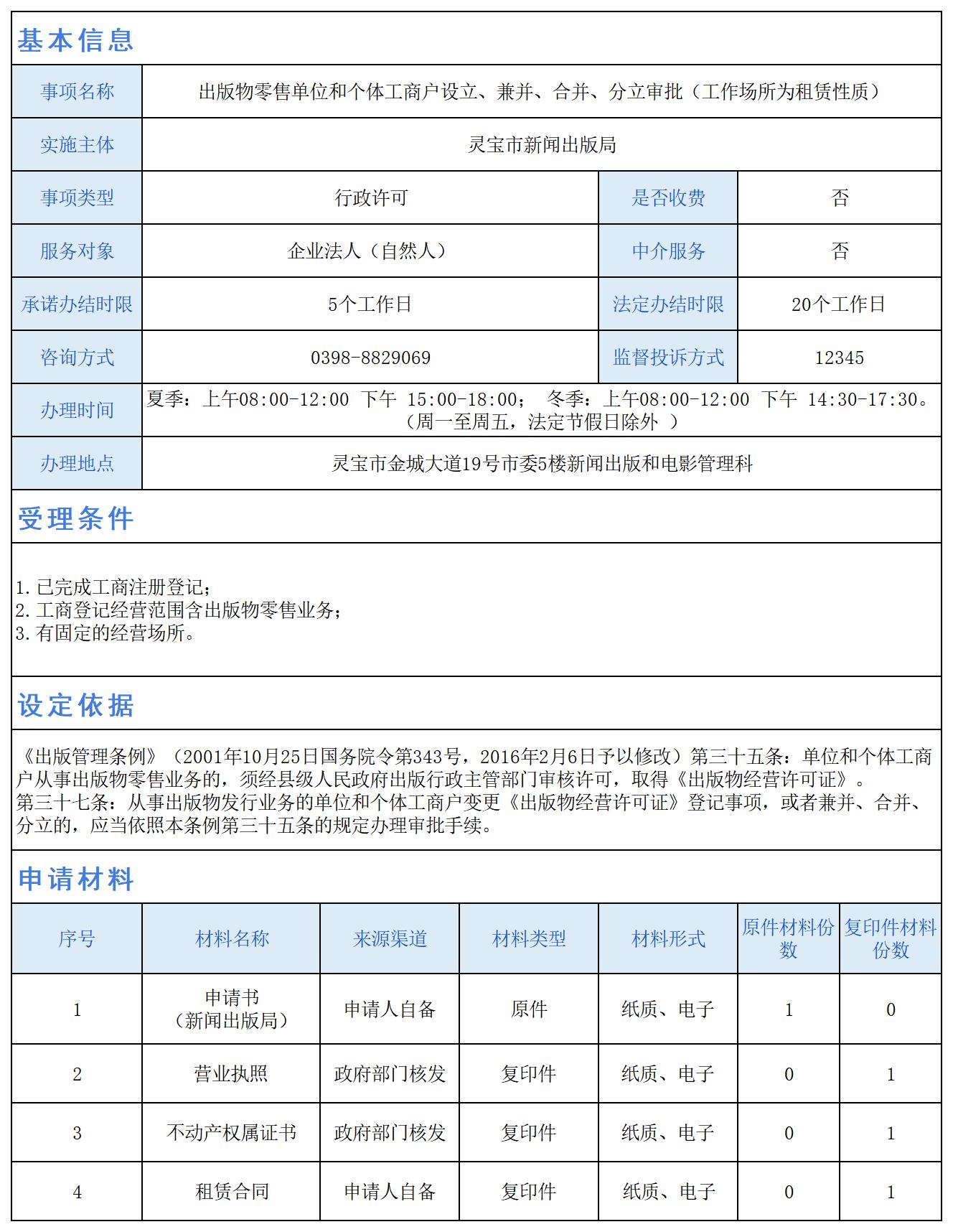 出版物零售单位和个体工商户设立、兼并、合并、分立审批(工作场所为租赁性质)