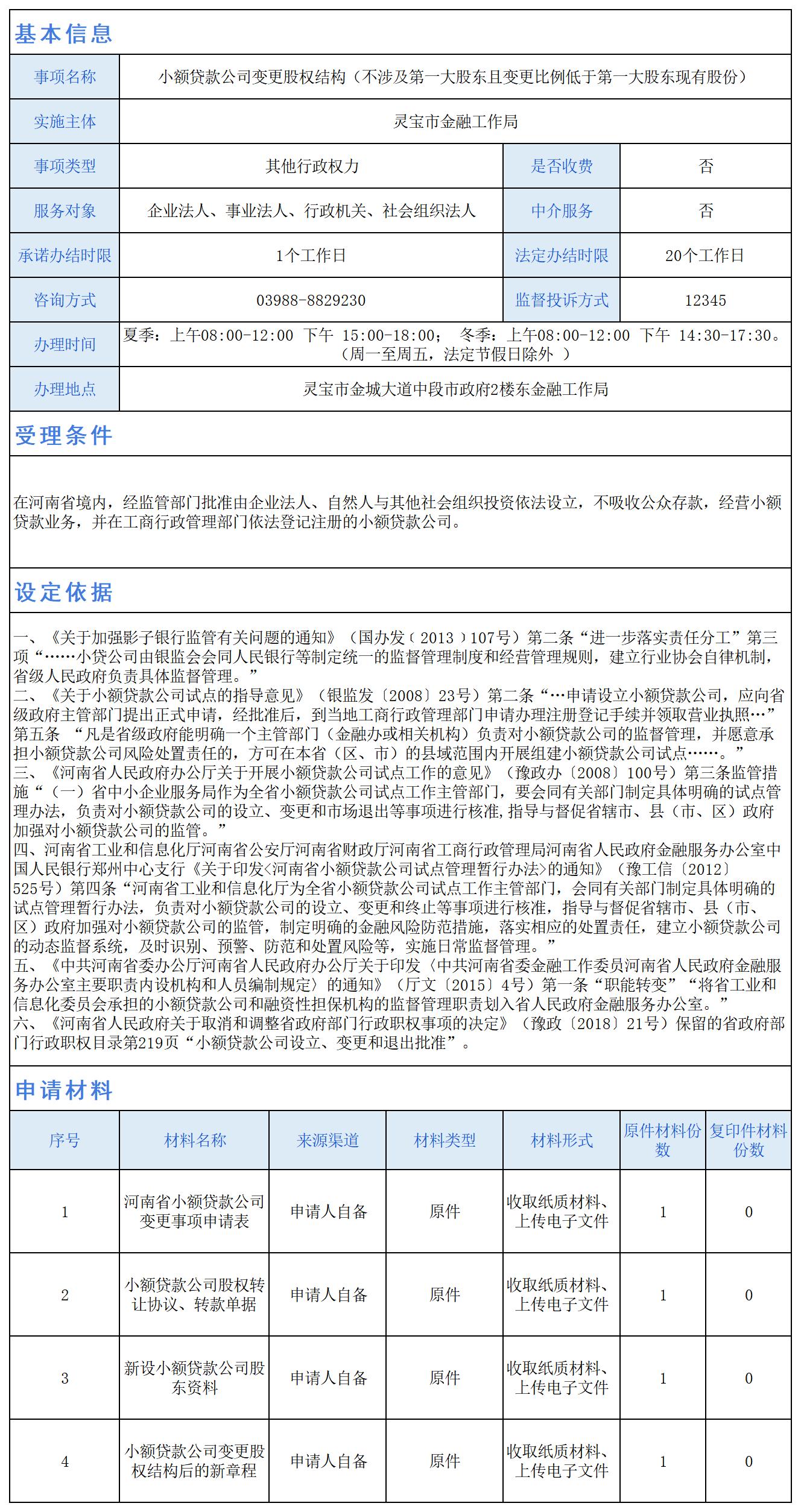 小额贷款公司变更股权结构(不涉及第一大股东且变更比例低于第一大股东现有股份)