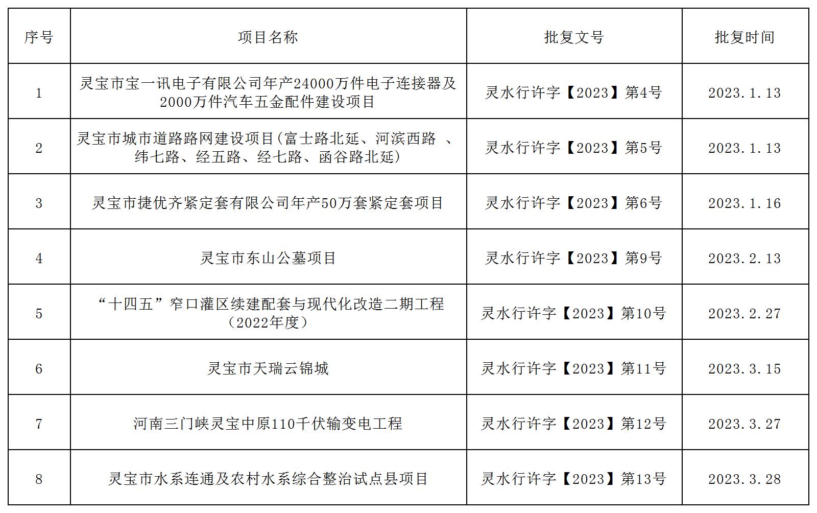 灵宝市水利局2023年第一季度水土保持方案审批汇总表
