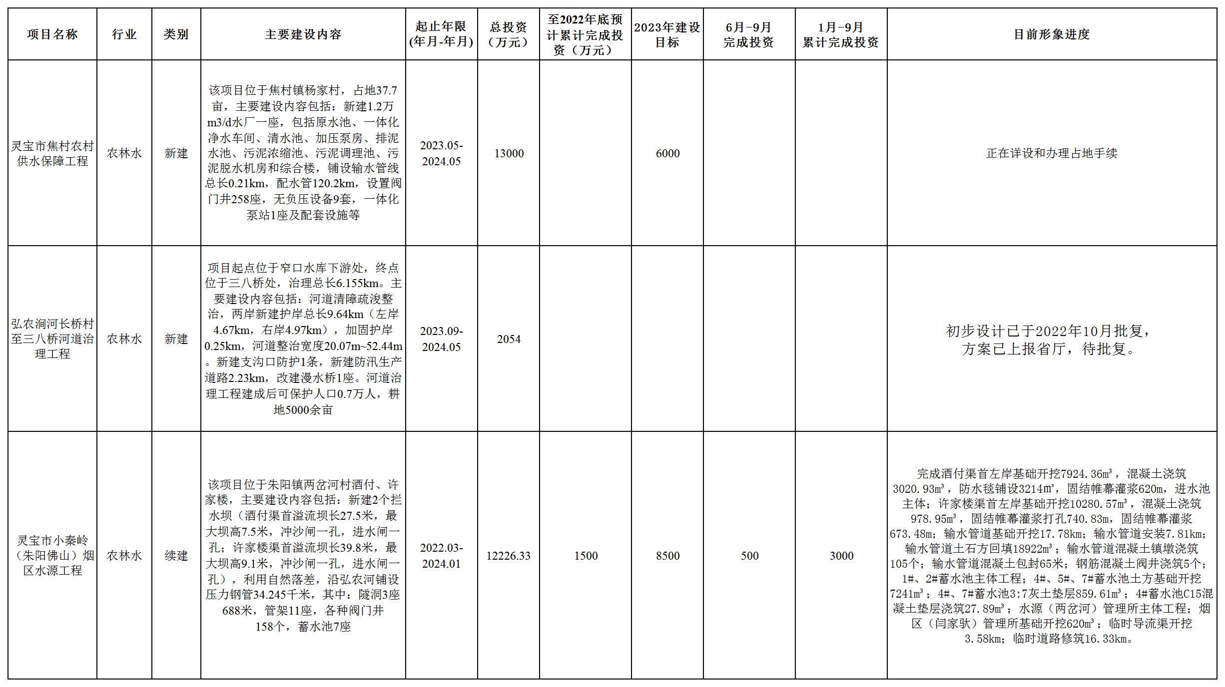 灵宝市水利局2023年新建、续建重点项目第三季度进展情况(2023年6-9月)