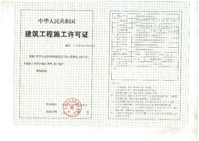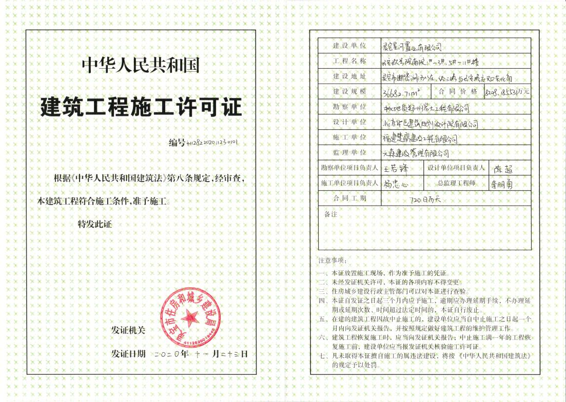 长安玖号院南院项目分别于2020年11月23日、2021年3月24日、2021年9月9日、2023年4月28日、2023年6月16日办理五个建筑工程施工许可证。