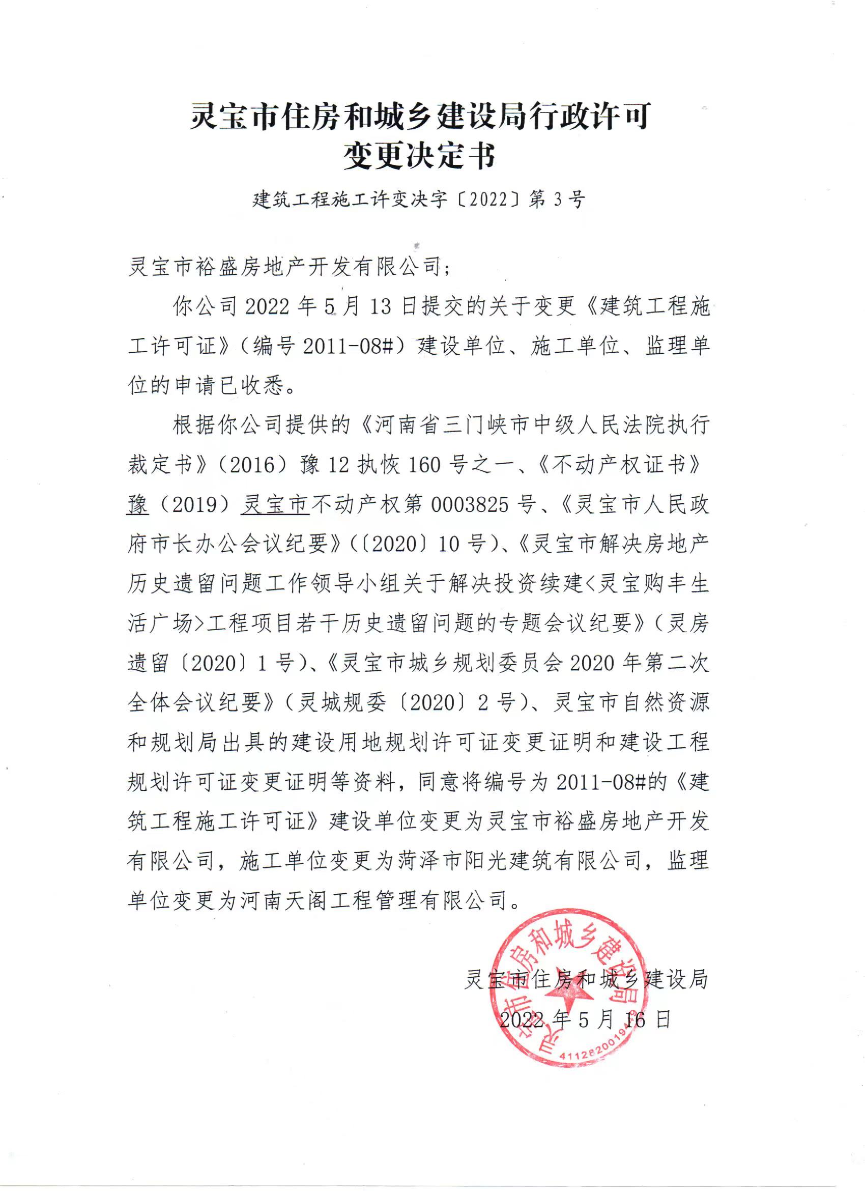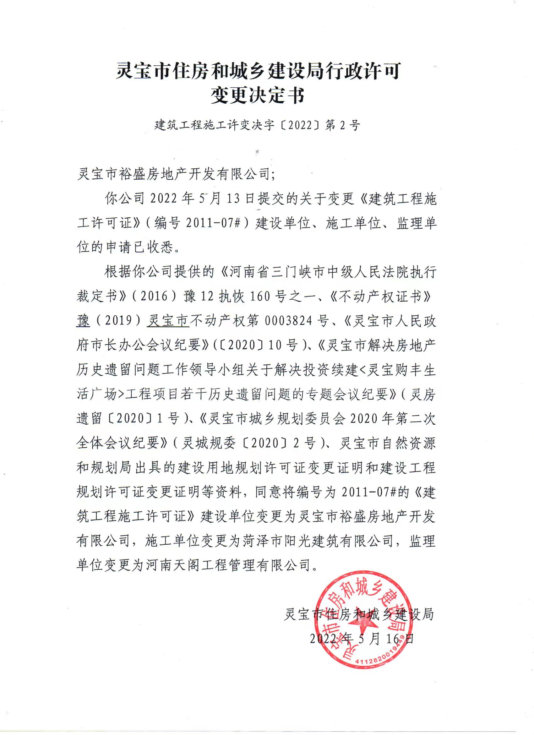 2021年5月21日将编号为2011-07#、2011-08#等两份《建筑工程施工许可证》上的工程名称变更为天基middot;茂业广场;设计单位变更为洛阳市规划建筑设计研究院有限公司;施工单位变更为菏泽市阳光建筑有限公司;监理单位变更为河南天阁工程管理有限公司。